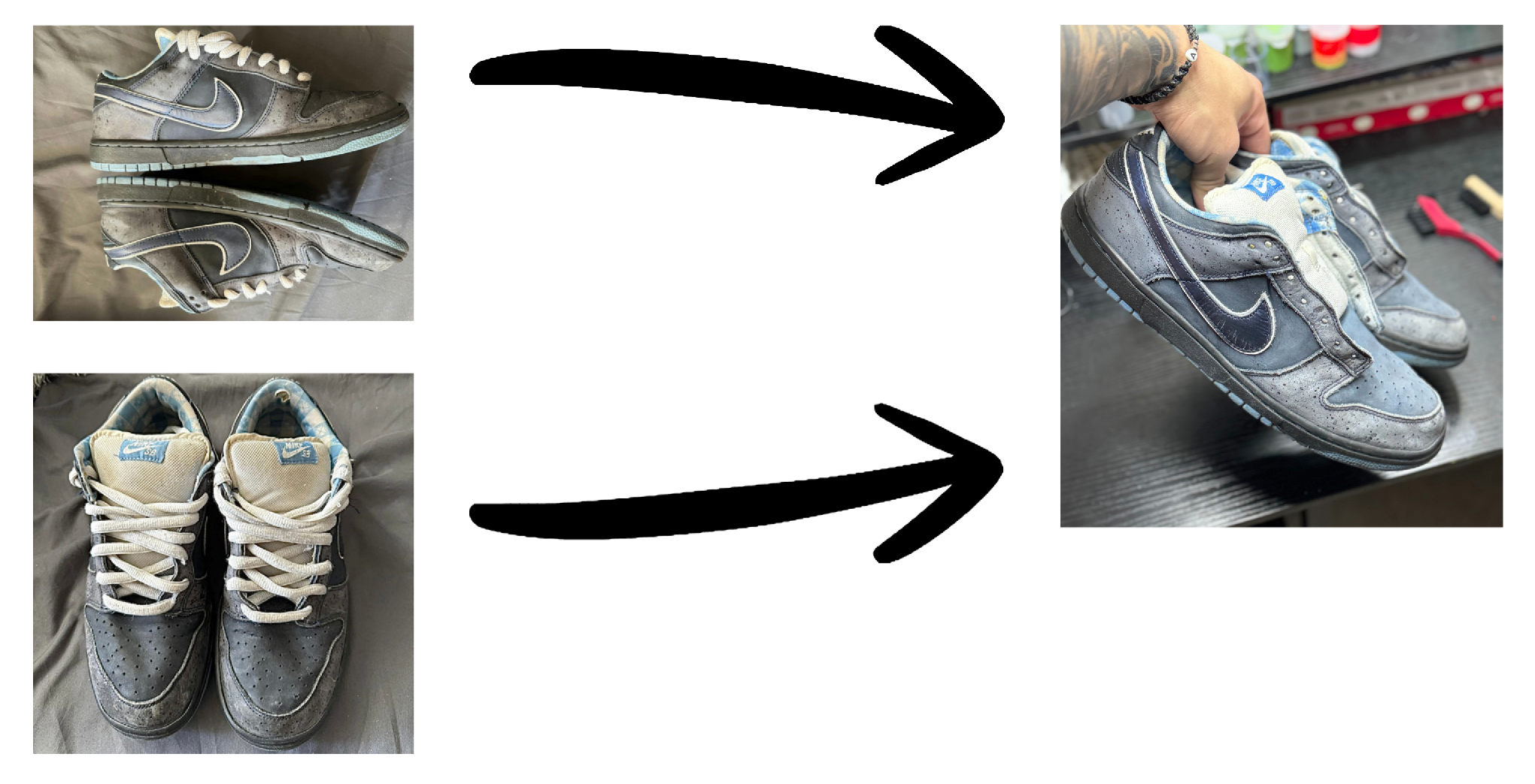 The client wanted to reverse general signs of wear: darkening leather and ‘dead’ suede, dulling of light blue outsoles, yellowing on tongue. Due to the age of the suede, extreme caution had to be taken, but we were able to revive that buttery texture and overall brighten up the shoe.