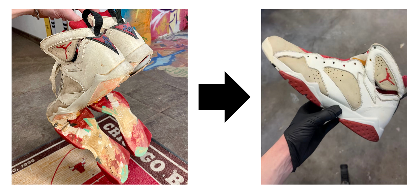 These OG Hare 7s were swapped for a popular sneaker store in Omaha. The client requested for only the left shoe to be reglued so they could have a before-and-after showcase. The shoes are currently in a display.